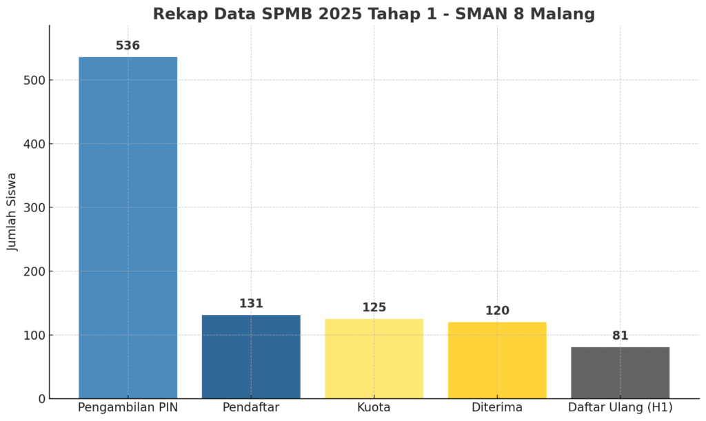 Antusiasme masyarakat terhadap proses SPMB 2025 di SMAN 8 Malang terlihat dari total pengambilan PIN yang mencapai 536 orang. Ini menunjukkan tingginya minat calon peserta didik dan orang tua untuk menjadi bagian dari keluarga besar SMAN 8 Malang.